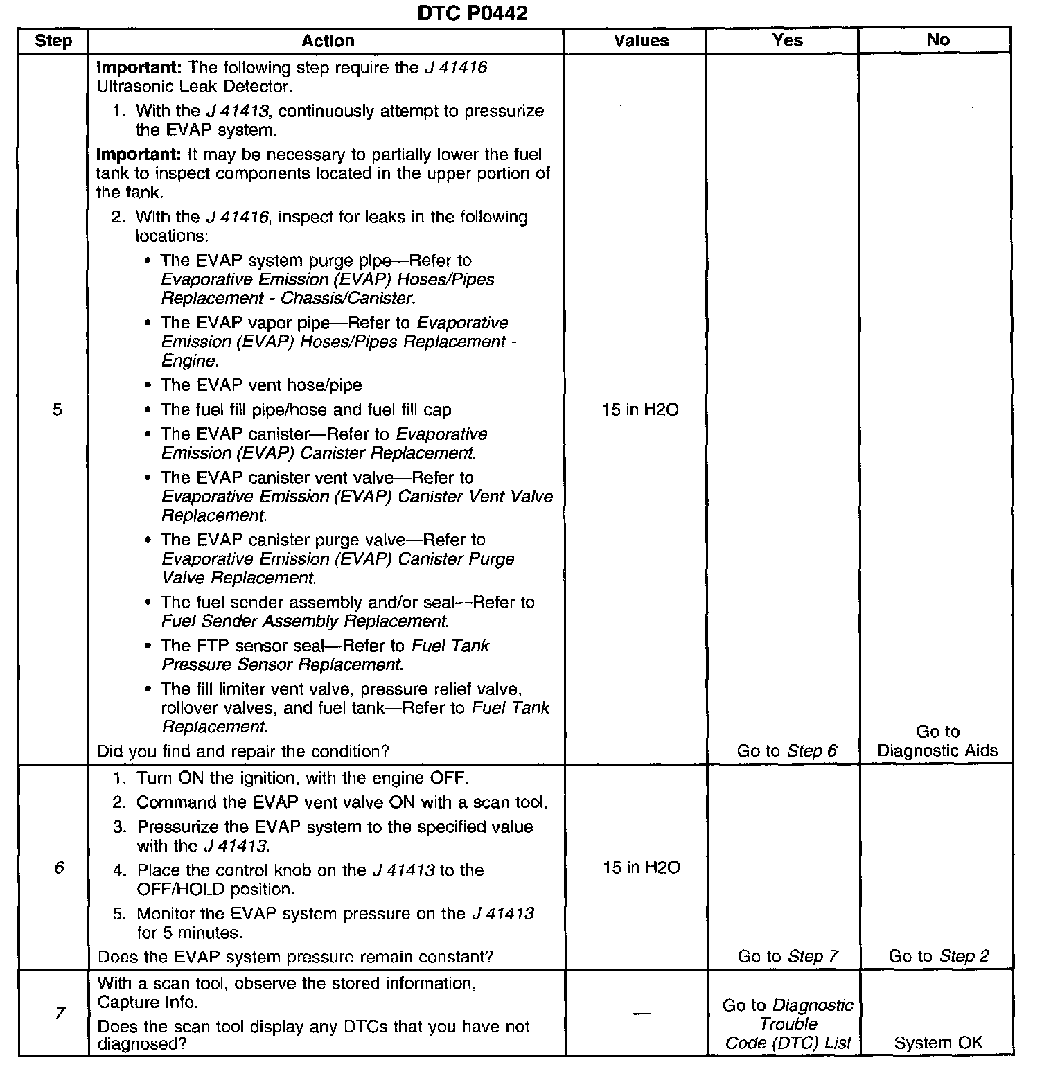 DESCRIPTIONThe EVAP small leak test applies vacuum to the Evaporative Emission (EVAP) system and monitors vacuum decay. The Powertrain Control Module (PCM) monitors the fuel tank pressure (FTP) sensor signal to determine the vacuum decay rate. At an appropriate time, the PCM turns the EVAP canister purge valve ON (open) and the EVAP vent valve ON (closed). This allows the engine to draw a vacuum on the EVAP system. At a calibrated time, or vacuum level, the PCM turns the purge valve OFF (closed), sealing the system, and monitors the FTP sensor input in order to determine EVAP system vacuum decay. If the system detects a leak larger than a calibrated amount Diagnostic Trouble Code (DTC) P0442 will set.
