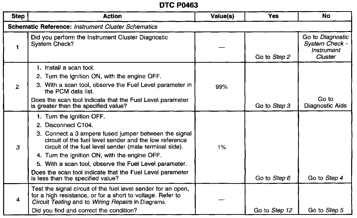 CIRCUIT DESCRIPTIONThe fuel level sender changes resistance based on fuel level. The PCM monitors the signal circuit of the fuel level sender in order to determine fuel level. When the fuel tank is full, the sender resistance is high and the PCM senses a high signal voltage. When the fuel tank is empty, the sender resistance is low and the PCM senses a low signal voltage. The PCM uses the signal circuit of the fuel level sender in order to calculate the total remaining fuel %) in the tank. The PCM sends the fuel level percent via the class 2 serial data circuit to the instrument cluster in order to control the fuel gauge. The fuel level information is also used for misfire and EVAP diagnostics.