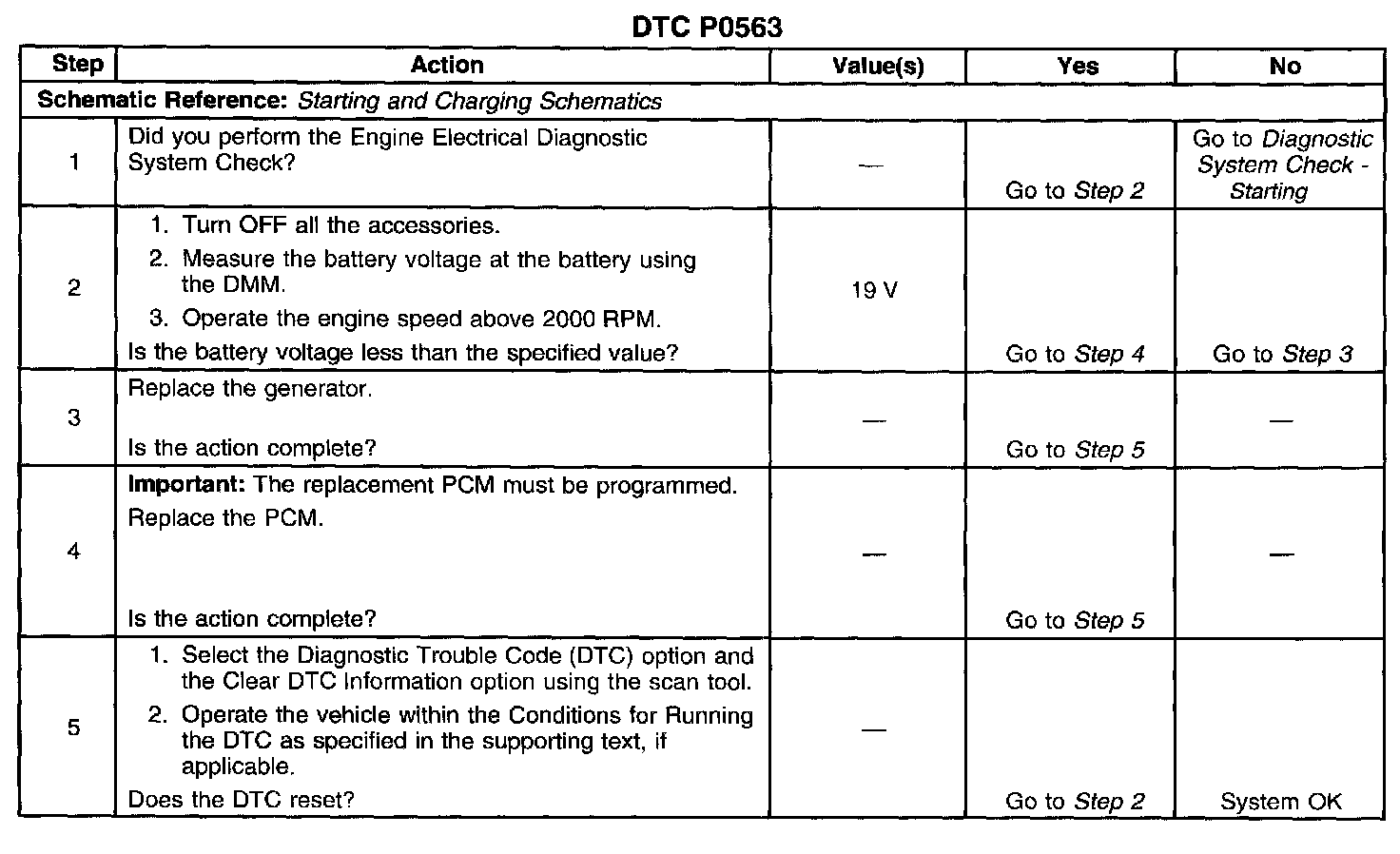 CIRCUIT DESCRIPTIONThe Powertrain Control Module (PCM) continuously monitors that the system voltage stays within the proper range. If the PCM detects an excessively high system voltage, DTC P0563 will set. A high voltage condition may cause a stalling condition or other driveability concerns.