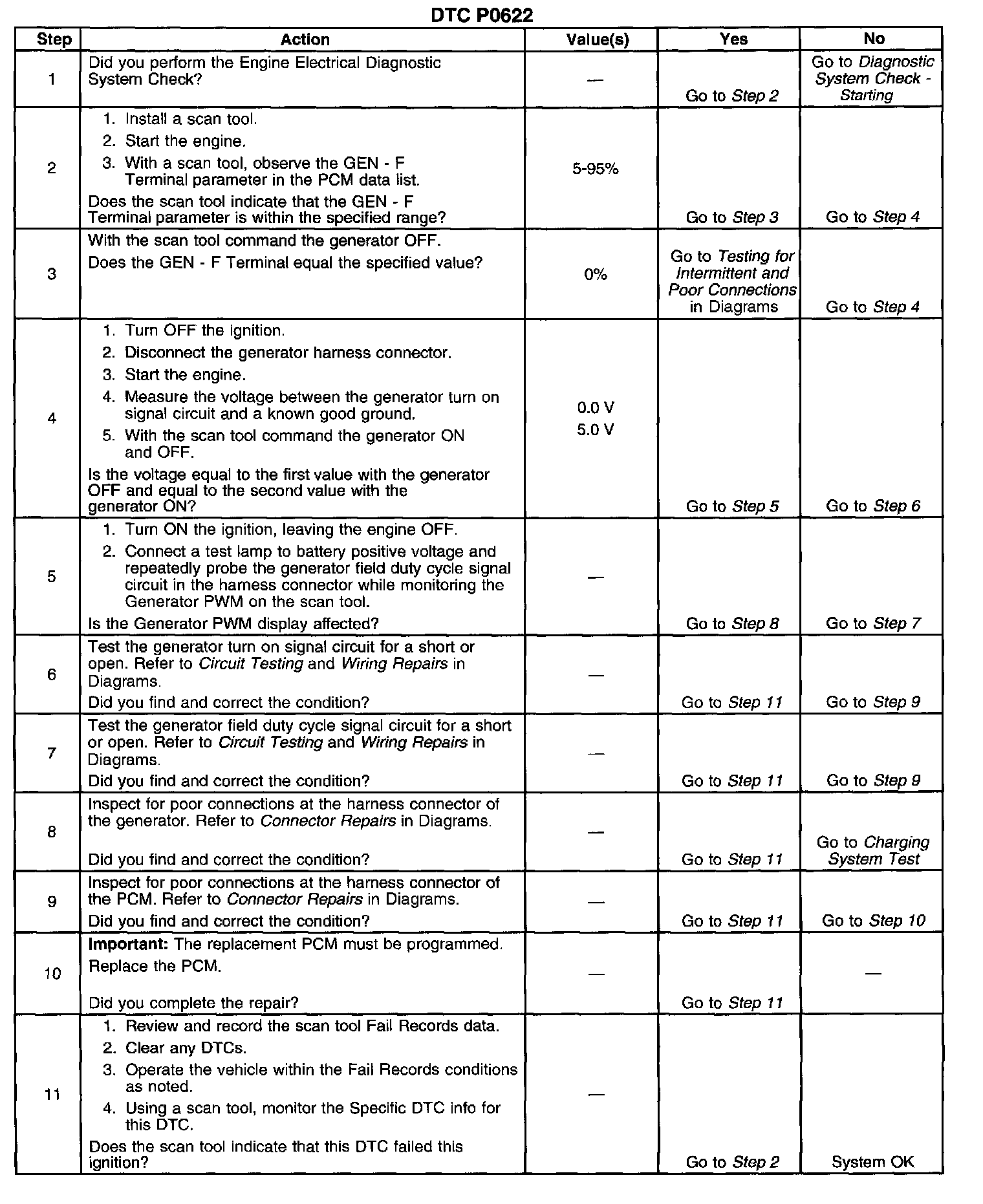 The PCM monitors the state of the generator field duty cycle signal circuit. When the key is in the RUN position and the engine is OFF, the PCM should detect a duty cycle near 0 percent. However, when the engine is running, the duty cycle should be between 5 percent and 100 percent. The PCM monitors the PWM signal using a key ON test and a RUN test. During the tests, if the PCM detects an out of range PWM signal, DTC P0622 will set. When the DTC sets, the PCM will send a class 2 serial data message to the IPC to illuminate the charge indicator.