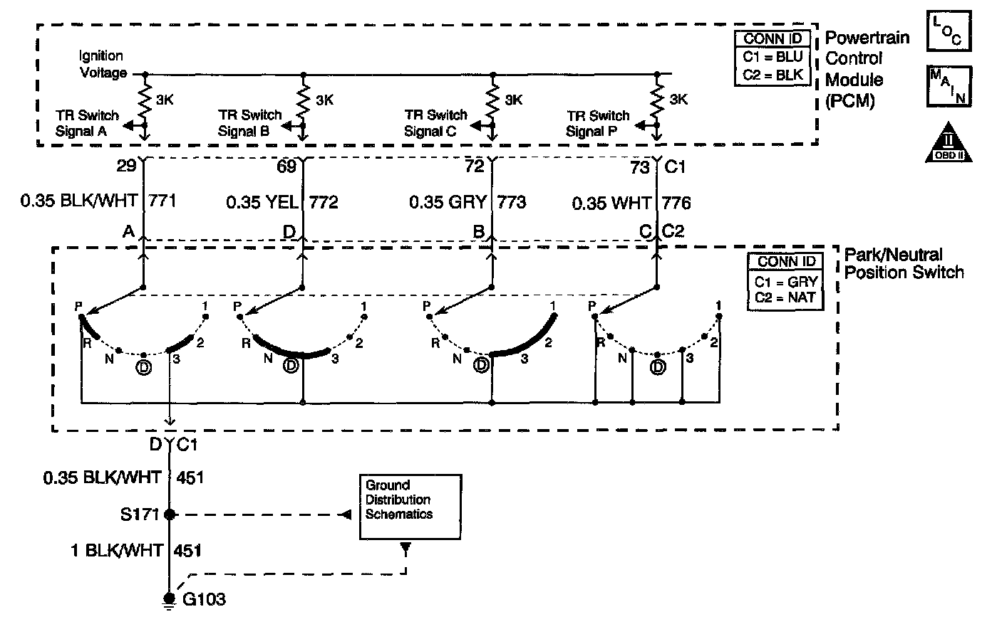 The Transmission Range (TR) switch is part of the park/neutral position and back-up lamp switch assembly and is externally mounted on the transmission manual shaft. The TR switch is a multi-signal switch. The PCM supplies ignition voltage to the TR switch on four signal circuits (A, B, C, and P). Each gear selector lever position grounds one or more of the switch circuits. In order to determine the gear range selected by the driver, the PCM compares the voltage combinations on the signal circuits to a look up table stored in the PCM memory. PCM detects the selected gear range by the state change of the switch input. Refer to Transmission Range Switch Logic table.