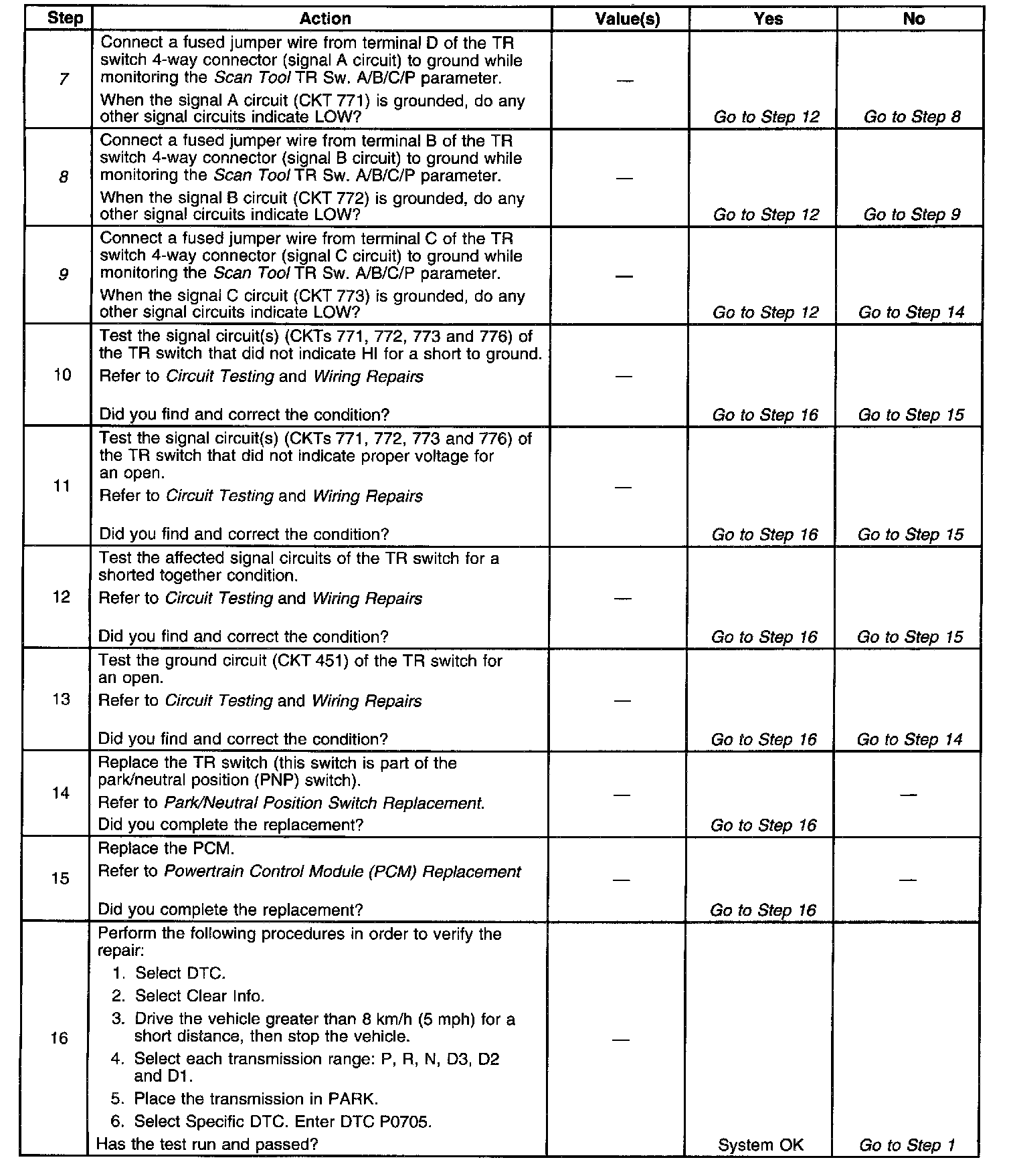6. This step tests TR switch wiring for an open or the lack of the signal voltage from the PCM.