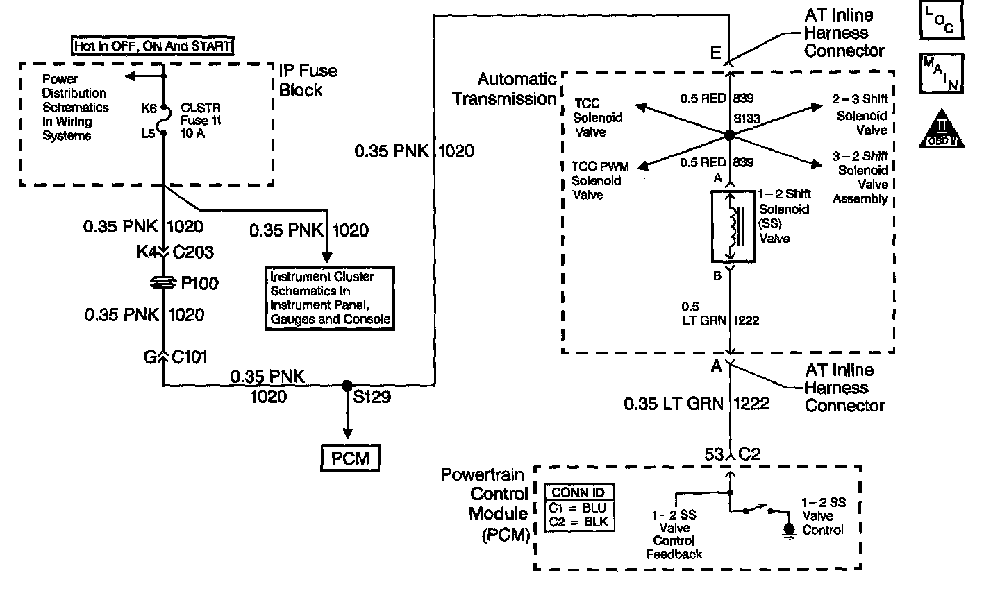 The 1-2 Shift Solenoid (SS) valve controls the fluid flow acting on the 1 -2 and 3-4 shift valves. The 1 -2 SS valve is a normally-open exhaust valve that is used with the 2-3 SS valve in order to allow four different shifting combinations. The solenoid attaches to the control valve body within the transmission. The 1-2 SS valve receives ignition voltage through the OFF/ON/START voltage circuit. The Powertrain Control Module (PCM) controls the solenoid by providing the ground path on the 1-2 shift solenoid valve control circuit.