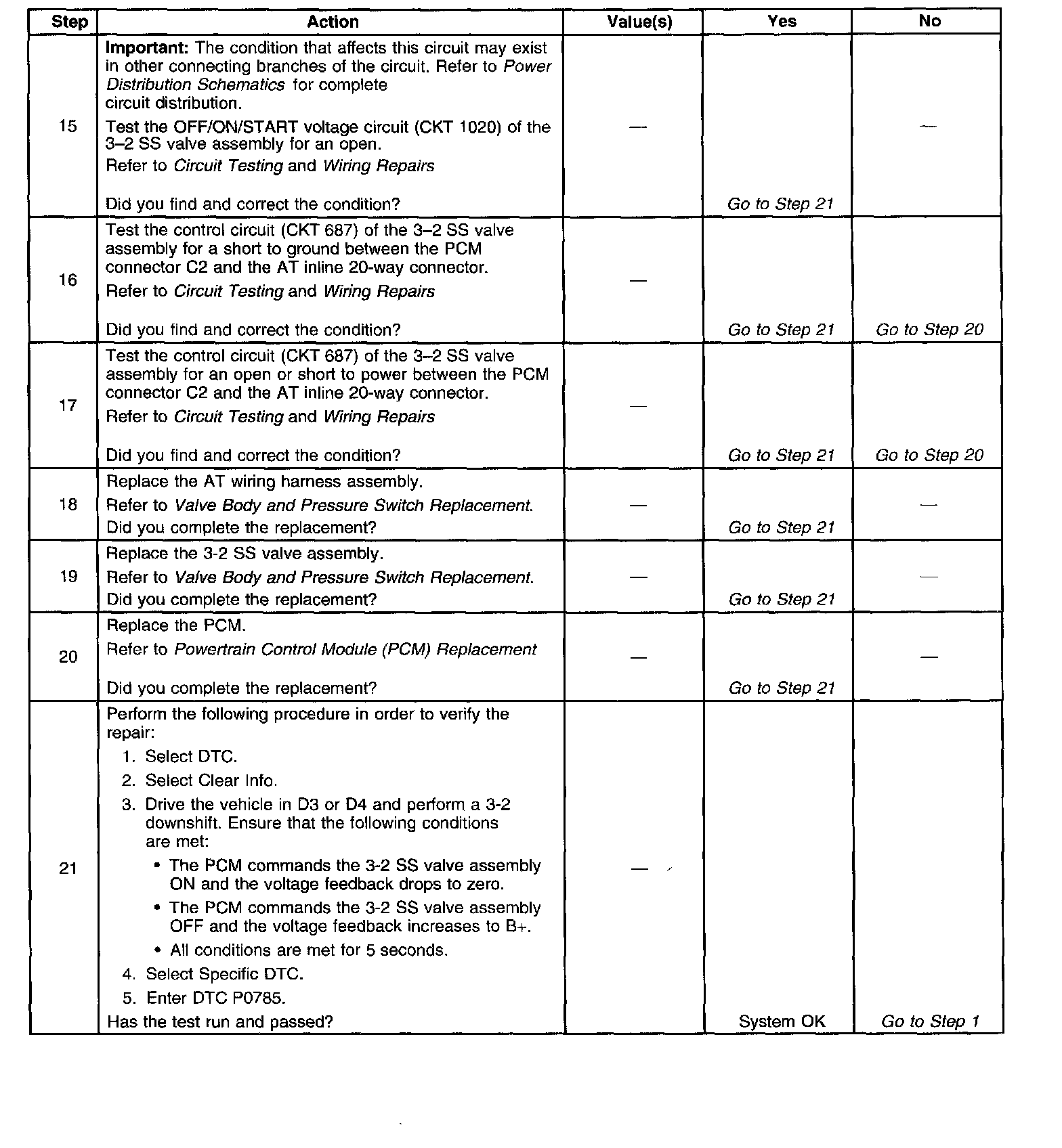 When the PCM detects a continuous open, short to ground or short to power in the 3-2 SS valve assembly circuit, then DTC P0785 sets. DTC P0785 is a type A DTC.