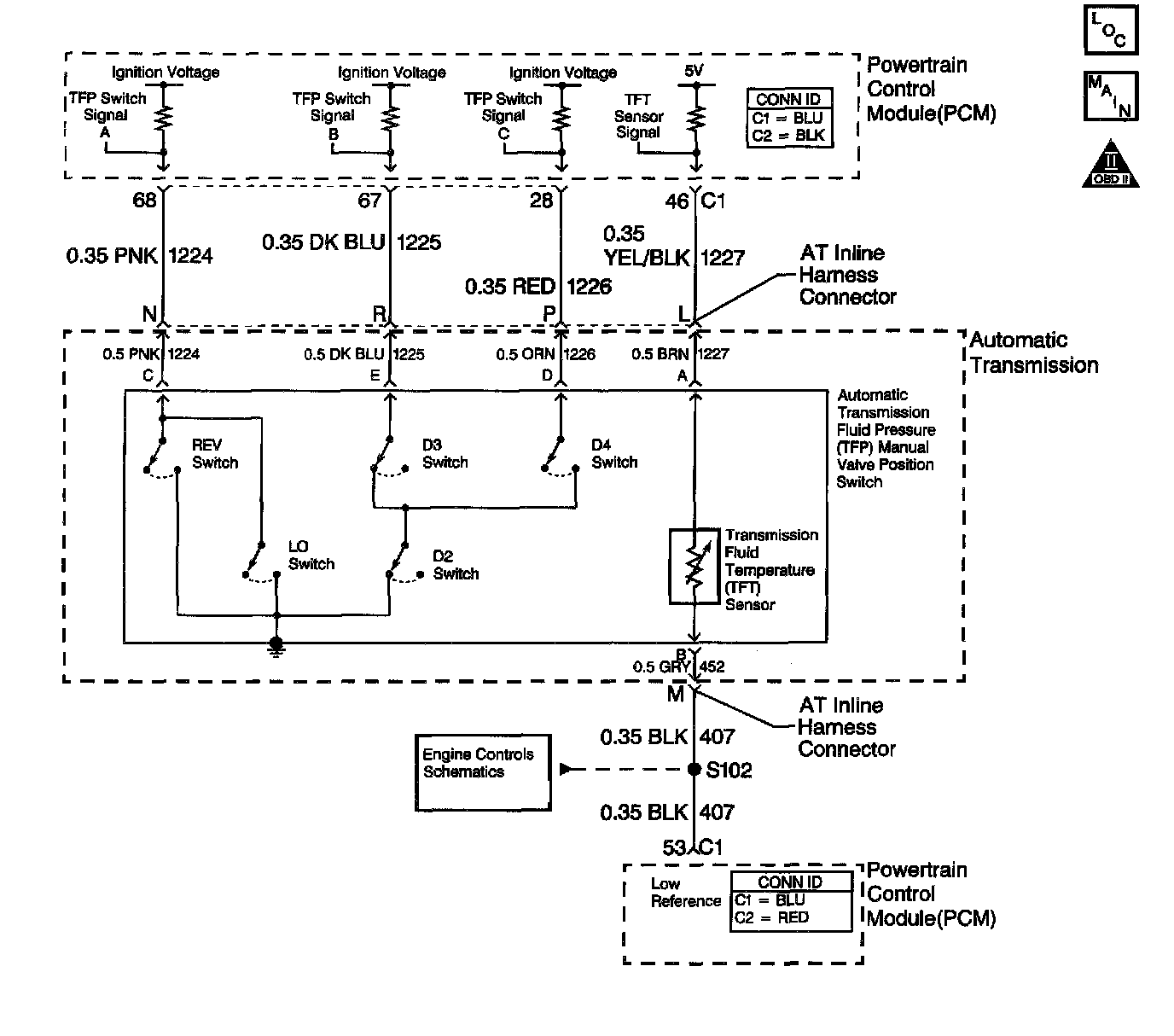 The Powertrain Control Module (PCM) supplies ignition voltage for each range signal. By grounding one or more of the circuits through various combinations of the pressure switches, the PCM detects which manual valve position you select. The PCM compares the actual voltage combination of the switches to a TFP manual valve position switch combination table stored in memory.
