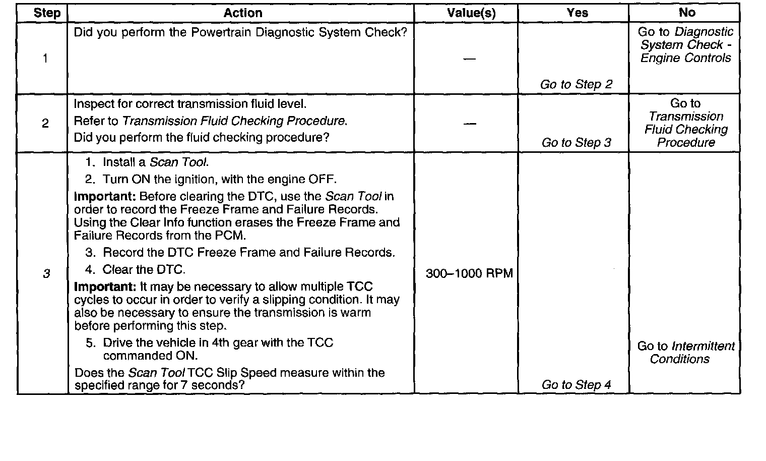 ^ Condition 2: If Condition 1 is met and the TCC slip speed is 200-1000 RPM for 7 seconds, then the PCM commands the TCC OFF for 1.5 seconds. - Condition 3: If Condition 2 is met and the TCC slip speed is 200-1000 RPM for 7 seconds, then the fail counter on the current ignition cycle is incremented.