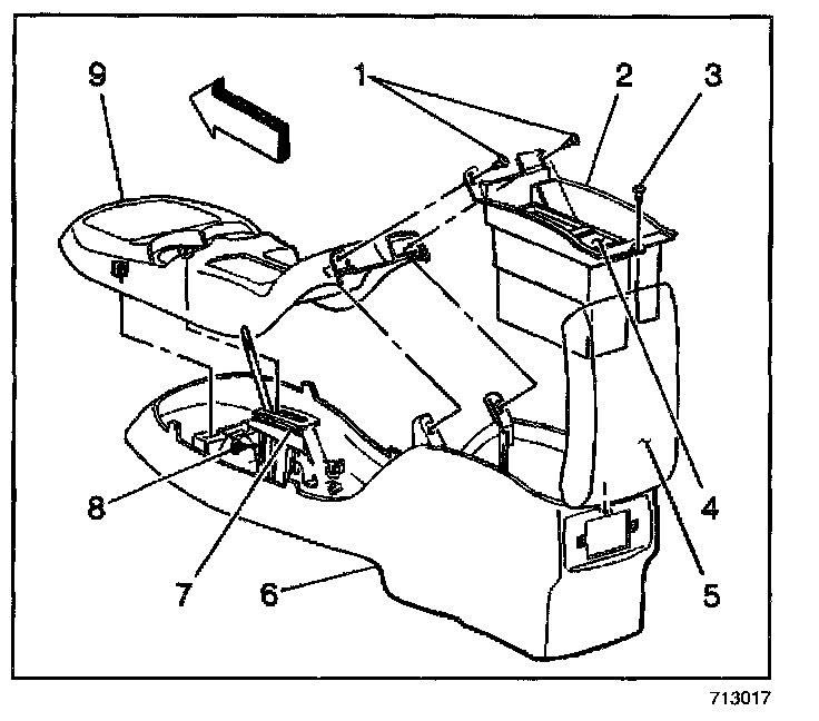 1. Open the armrest (5) on the center console to reveal the remote CD changer assembly.