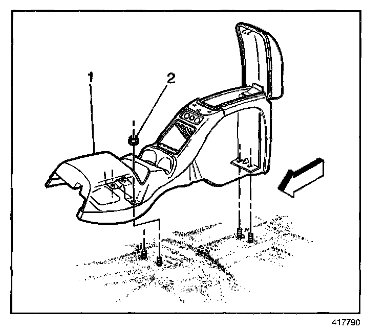 6. Remove the fasteners (2) that retain the console (1) to the shifter assembly and the vehicle floor.