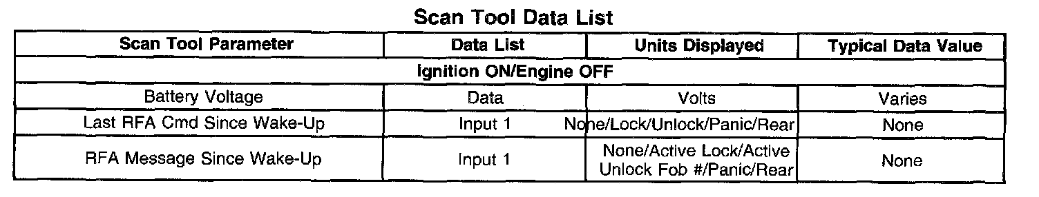 The Keyless Entry Scan Tool Data List contains all of the keyless entry related parameters that are available on the scan tool. The parameters in the list are arranged in alphabetical order. The column, "Data List," indicates the location of the parameter within the scan tool menu selections. Use the keyless Entry Scan Tool Data List as directed by a diagnostic table or in order to supplement the diagnostic procedures. Begin all of the diagnostic procedures with Diagnostic System Check - Remote Keyless Entry.