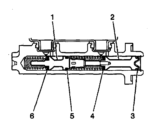 8. If the brake pedal apply did not feel spongy, and the brake pedal travel was initially steady and not excessive, but then gradually fell, then the master cylinder requires overhaul or replacement due to an internal leak past the secondary piston (1) from the secondary piston primary seal (6) or secondary seal (5).