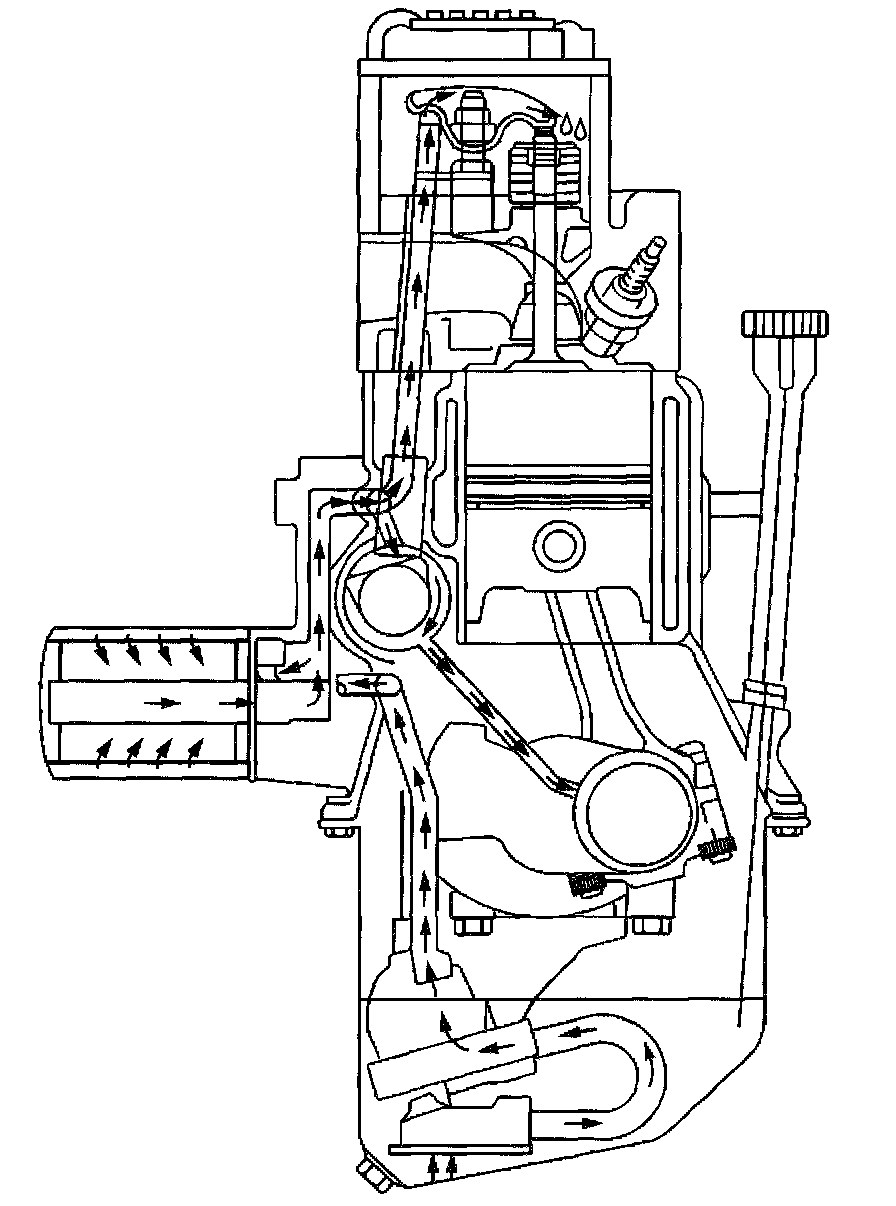 Front ViewFull pressure lubrication, through a full-flow oil filter is supplied by a gear-type oil pump. Oil is drawn up through the oil pump screen and passes through the pump to the oil filter. The oil filter is a full-flow paper element unit with an anti-drain back valve. An oil filter bypass valve is used to ensure adequate oil supply, in the event the filter becomes plugged or develops excessive pressure drop. Filtered oil flows into the main gallery and then to the camshaft, the balance shaft, the rear bearing, and the crankshaft bearings. The valve lifter oil gallery supplies oil to the valve lifters. Oil flows from the valve lifters through the hollow valve pushrods to the valve rocker arms. Oil drains back to the crankcase through the oil drain holes in the cylinder head. The camshaft timing chain is drip fed from the front camshaft bearing. The pistons and piston pins are lubricated by oil splash.