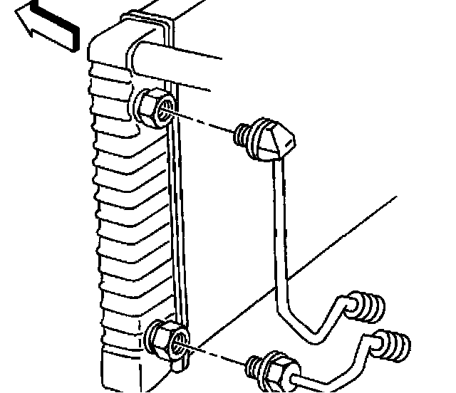 11. Remove the engine oil cooler lines from the quick connectors at the radiator engine oil cooler inlet and outlet. Pull the lines straight out from the connectors.