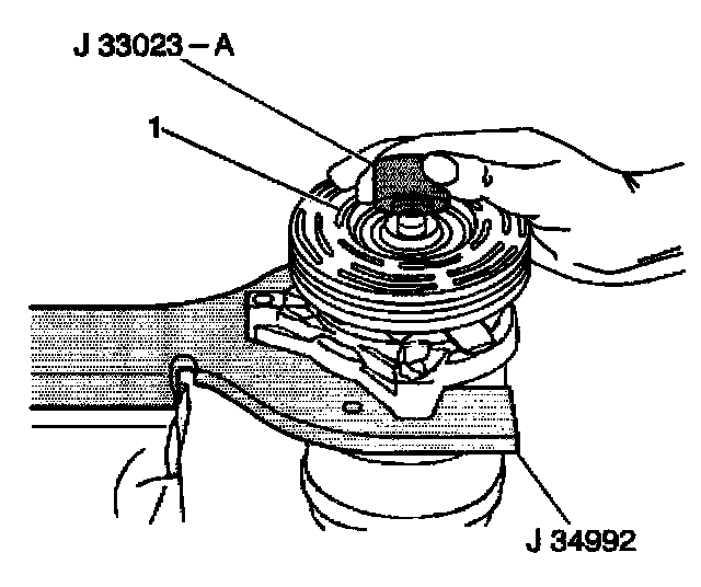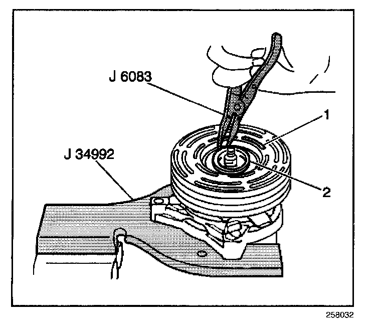 10. Tighten the J 8433-3 against the puller pilot in order to remove the clutch coil (2).