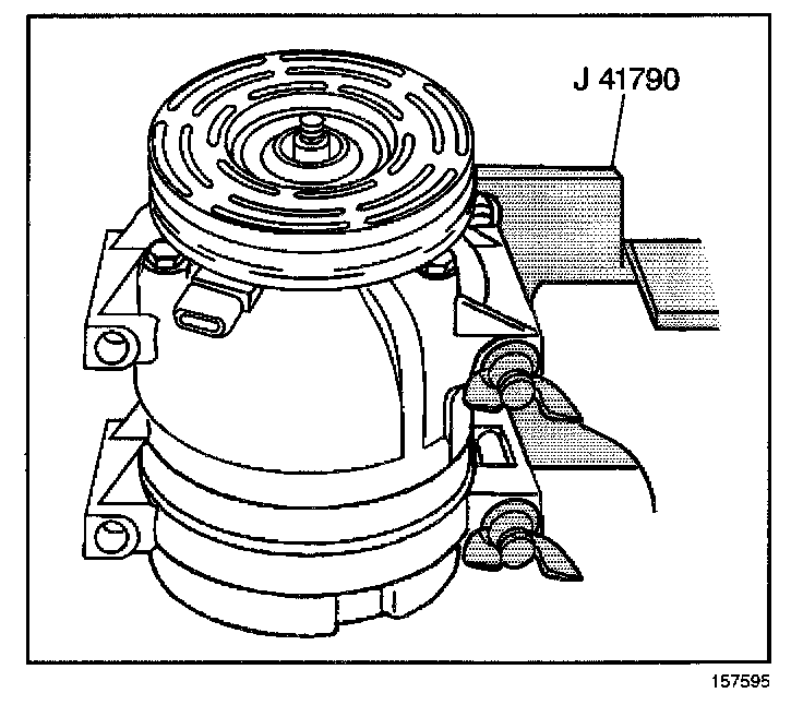 2. Clamp the A/C compressor holding fixture, J 41790 in a vise and attach the A/C compressor to the J 41790.