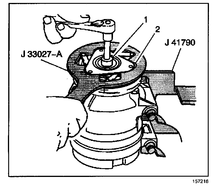 3. Hold the clutch hub and drive plate assembly (2) in place using the J 33027-A.