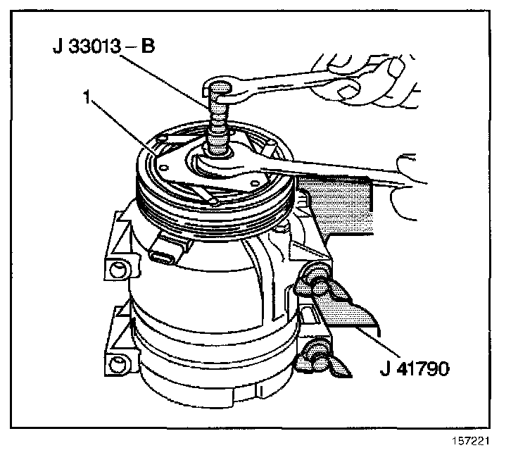 6. Remove the hub and drive plate assembly (1) by turning the center screw into the body of the J 33013-B and against the A/C compressor shaft.