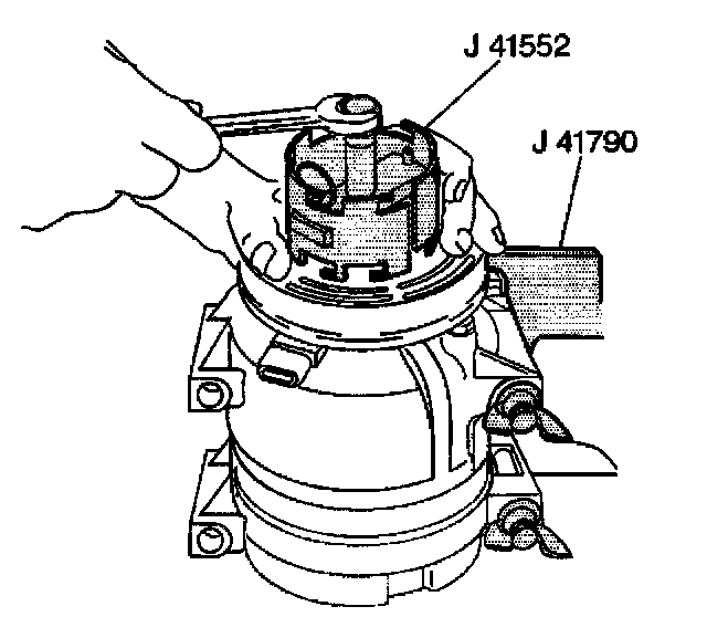 2. Clamp the A/C compressor holding fixture, J 41790 in a vise and attach the A/C compressor to the J 41790.