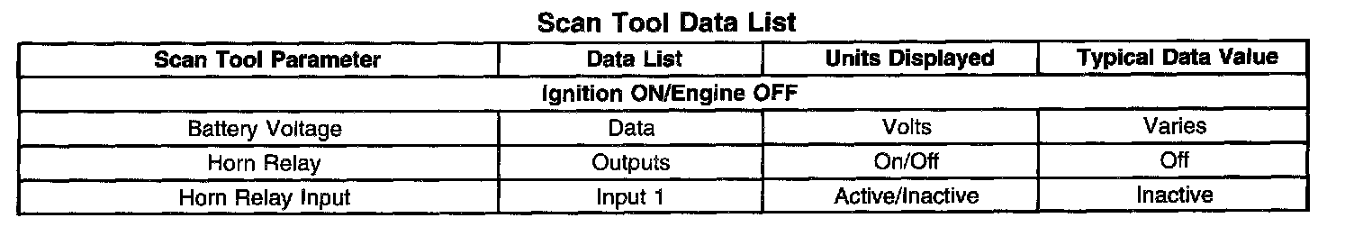 The Horns Scan Tool Data List contains all of the horn related parameters that are available on the scan tool. The parameters in the list are arranged in alphabetical order. The column, "Data List," indicates the location of the parameter within the scan tool menu selections. Use the Horns Scan Tool Data List as directed by a diagnostic table or in order to supplement the diagnostic procedures. Begin all of the diagnostic procedures with Diagnostic System Check - Horns.