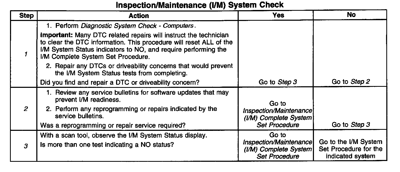 1. Any DTCs set, even those that are not listed in the Inspection/Maintenance System DTC Table, may prevent the required DTCs from running. If there is any question as to whether a set DTC is disabling the required I/M diagnostic, review the Conditions for Running in the diagnostic procedures for the DTC required by the I/M diagnostic. A list of disabling DTCs, if applicable, is contained in the supporting text for that DTC.