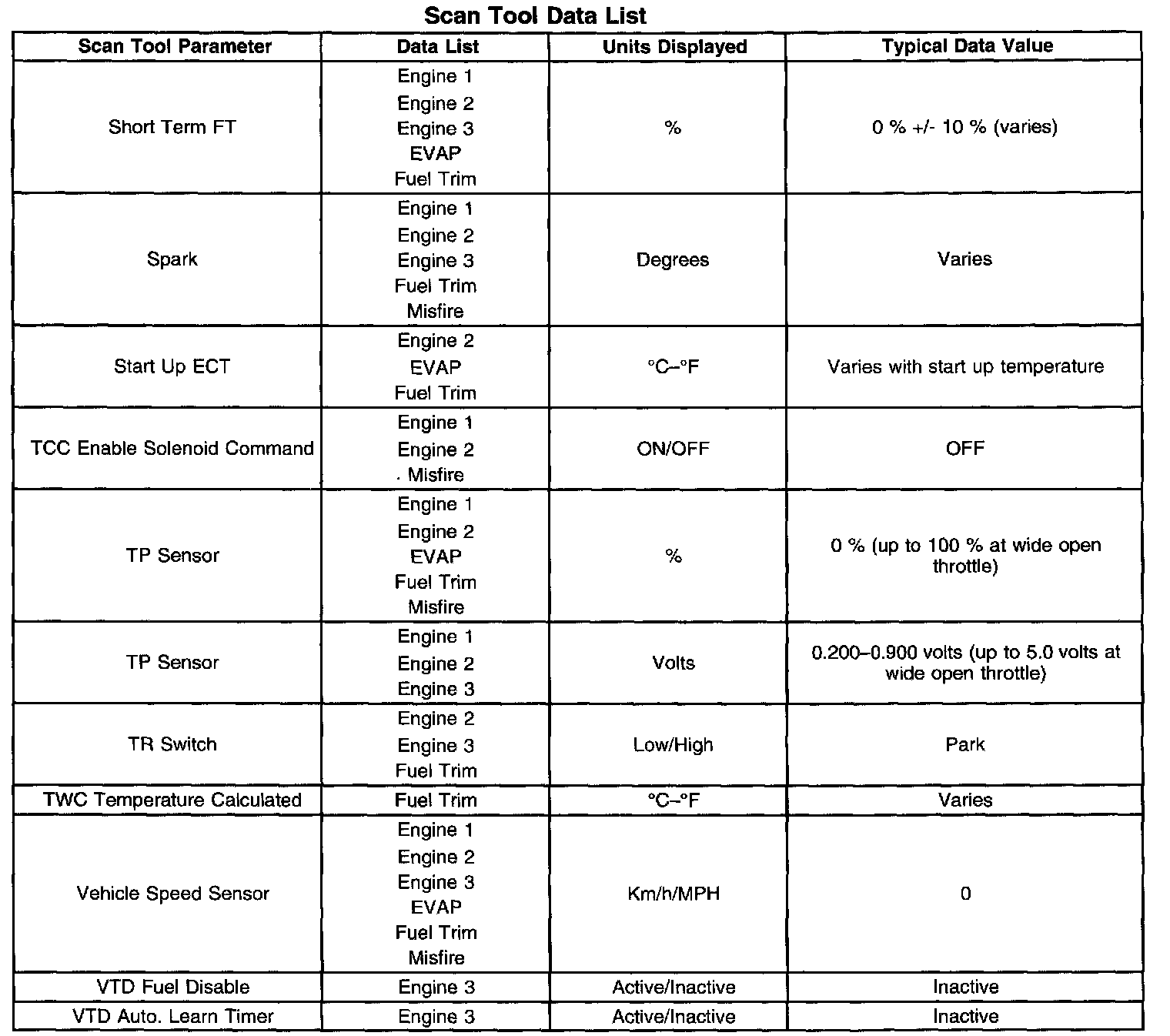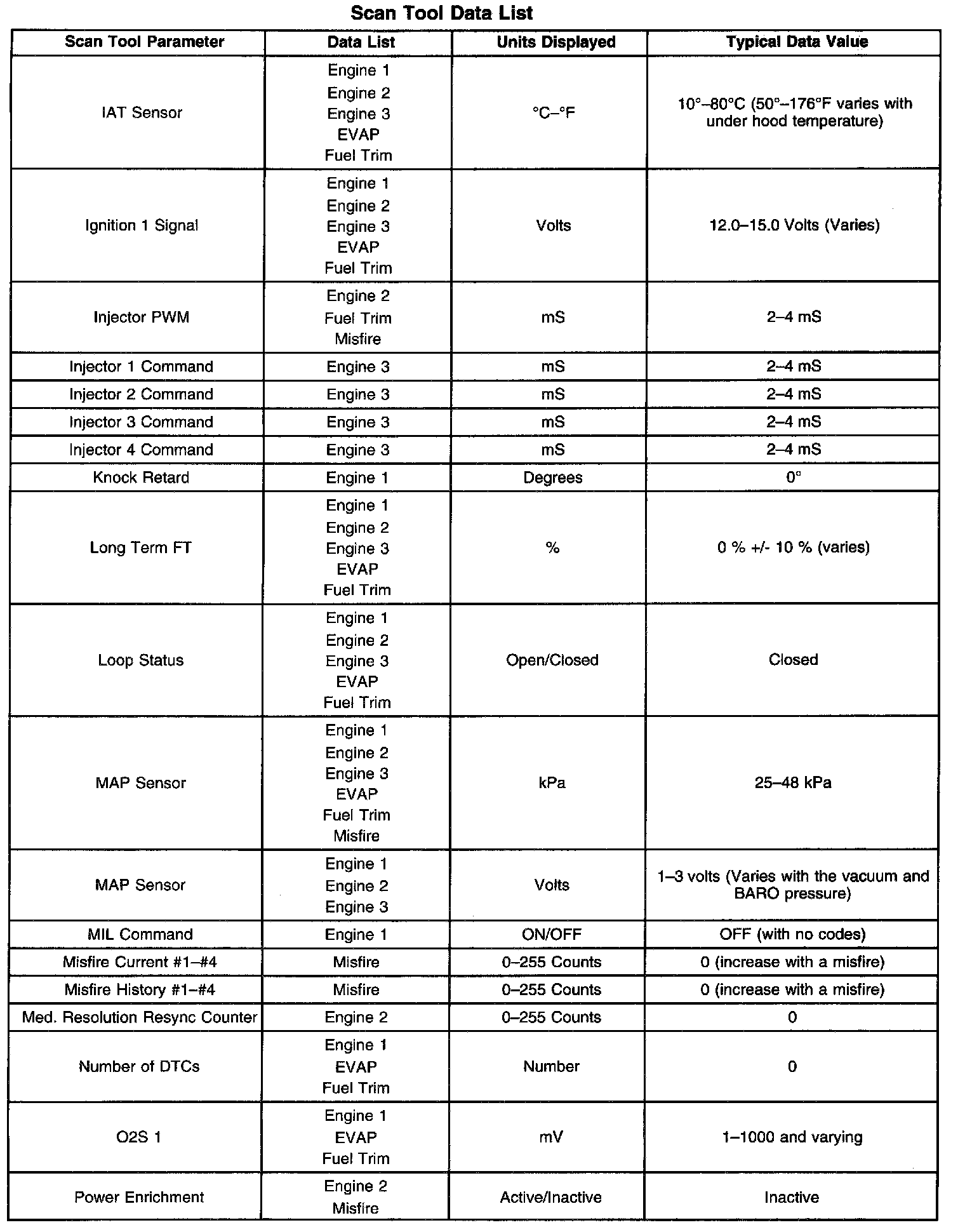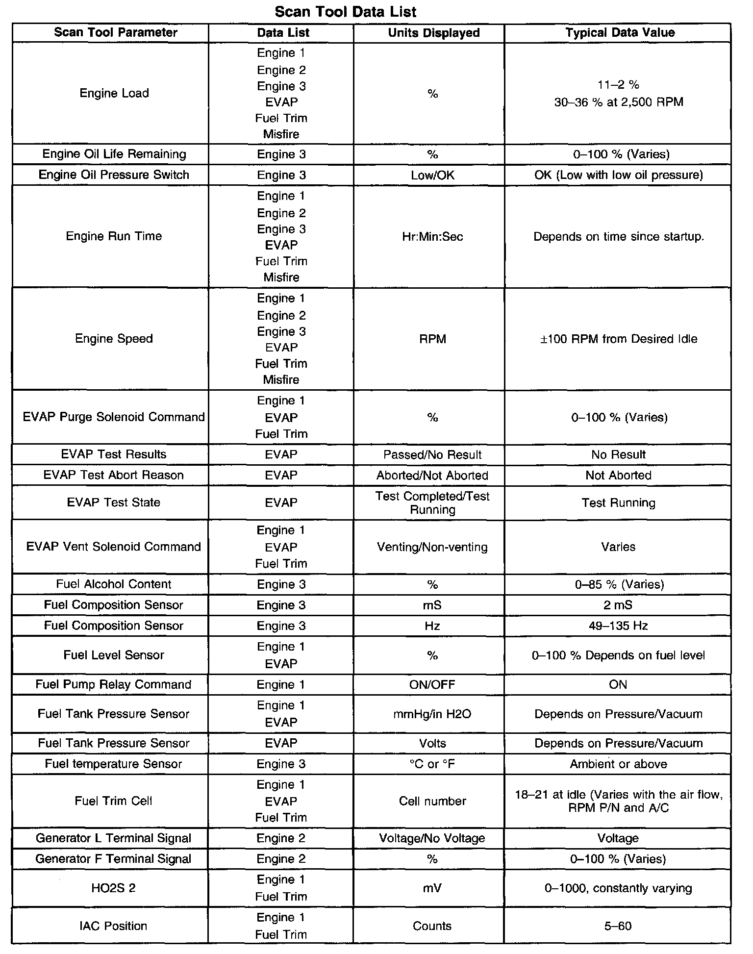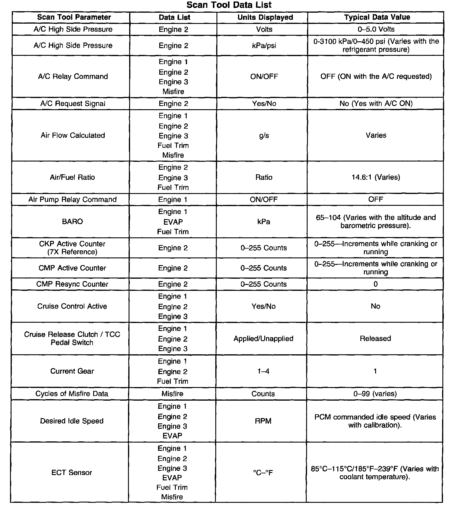 The Engine Scan Tool Data List contains all engine related parameters that are available on the scan tool. The list is arranged in alphabetical order. The parameters in the Typical Scan Data values column represent values that would be seen on a normally running engine.
