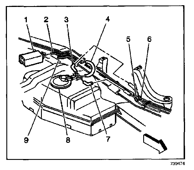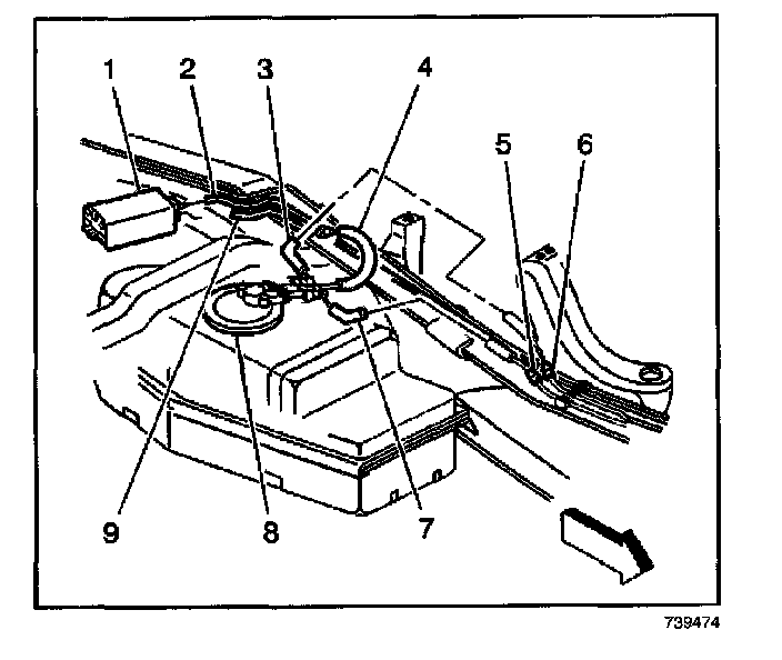 7. Disconnect the fuel feed pipe (3) and the fuel return pipe (7) from the fuel sender (8).