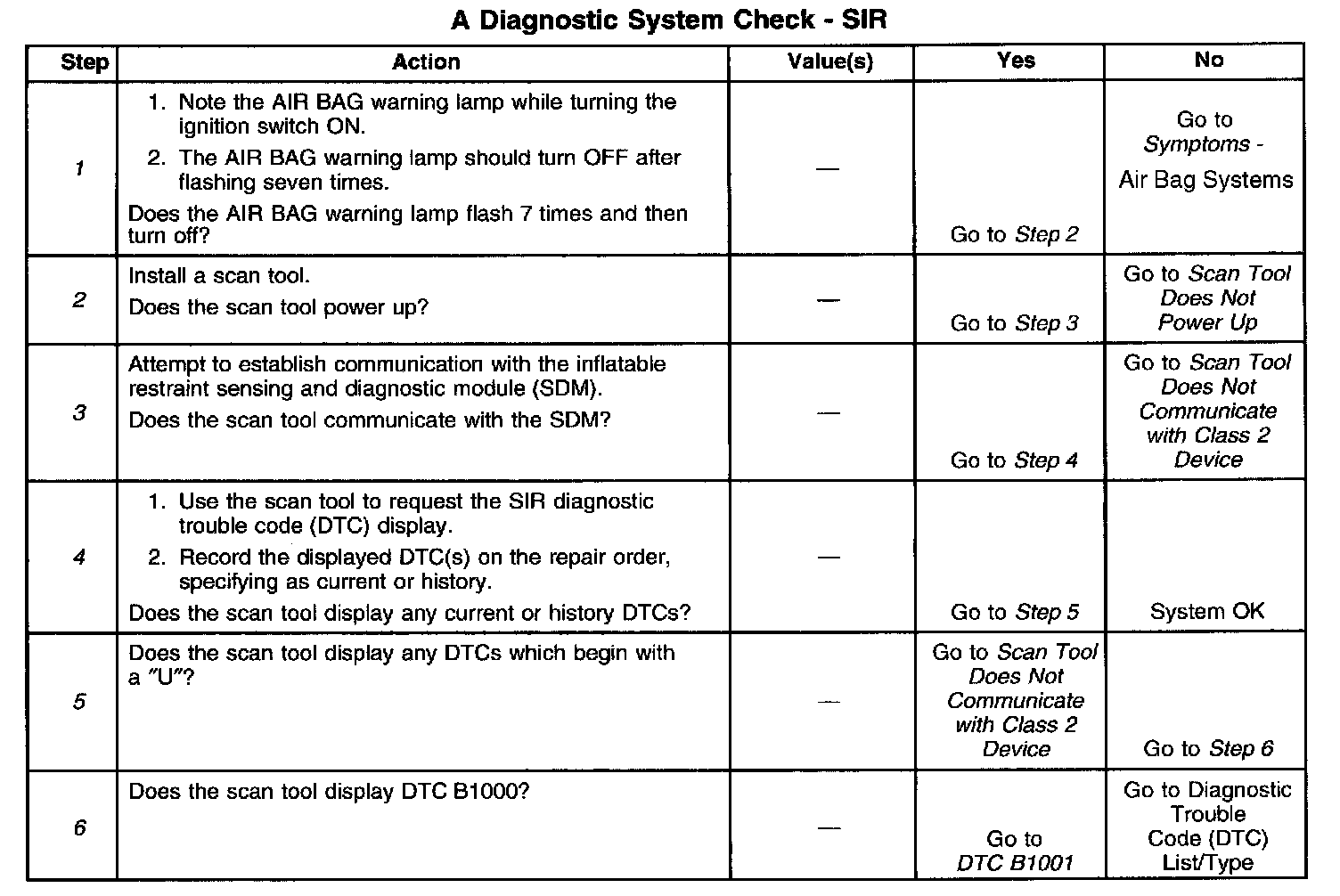 2. refer to the diagnostic label as directed by the A Diagnostic System Check-SIR. The diagnostic tables will help enable you to diagnose any SIR system malfunction. Bypassing these procedures may result in the following problems: