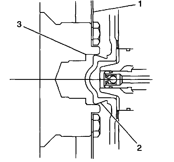 3. Align the torque converter hub (2) in the engine crankshaft (3) and install the torque converter to flywheel bolts.
