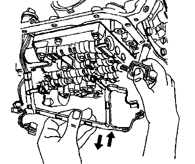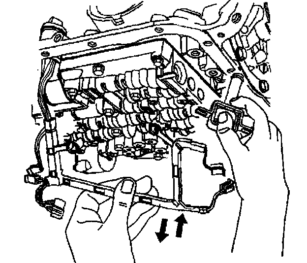 10. Remove the TCC solenoid retaining bolts and the valve body bolts which retain the internal wiring harness.