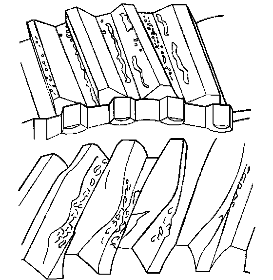 The polished tooth flanks show signs of ripple-like alterations in the surface structure which run perpendicular to the direction of sliding (resembling a washboard).