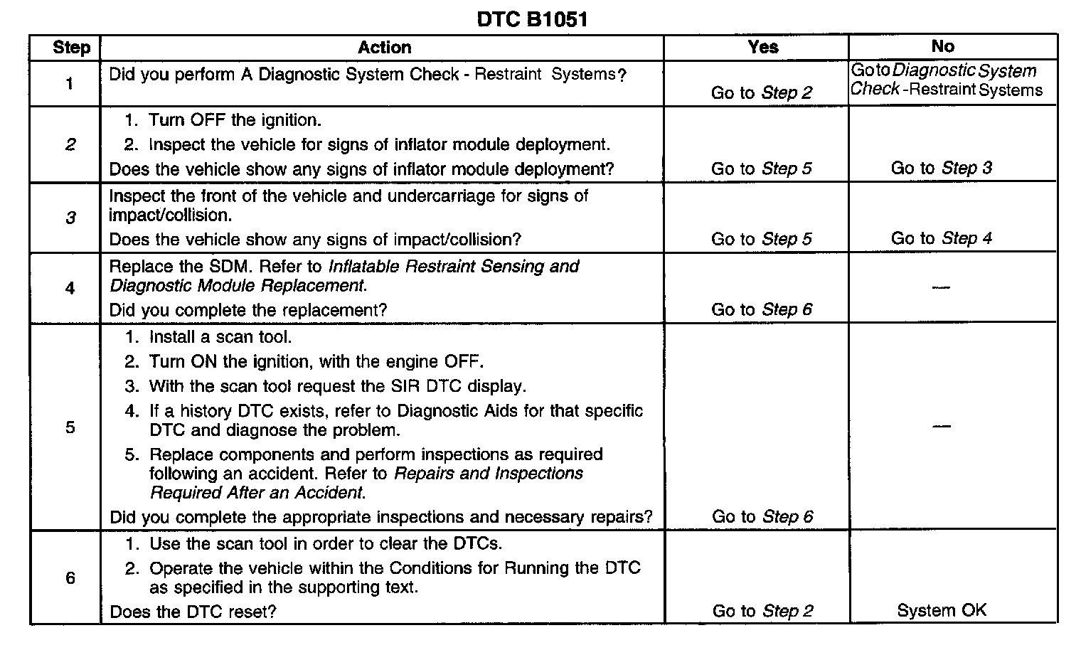 2. This step checks for evidence of inflator module deployment. If no evidence of inflator module deployment exists, DTC B1051 may have set falsely.