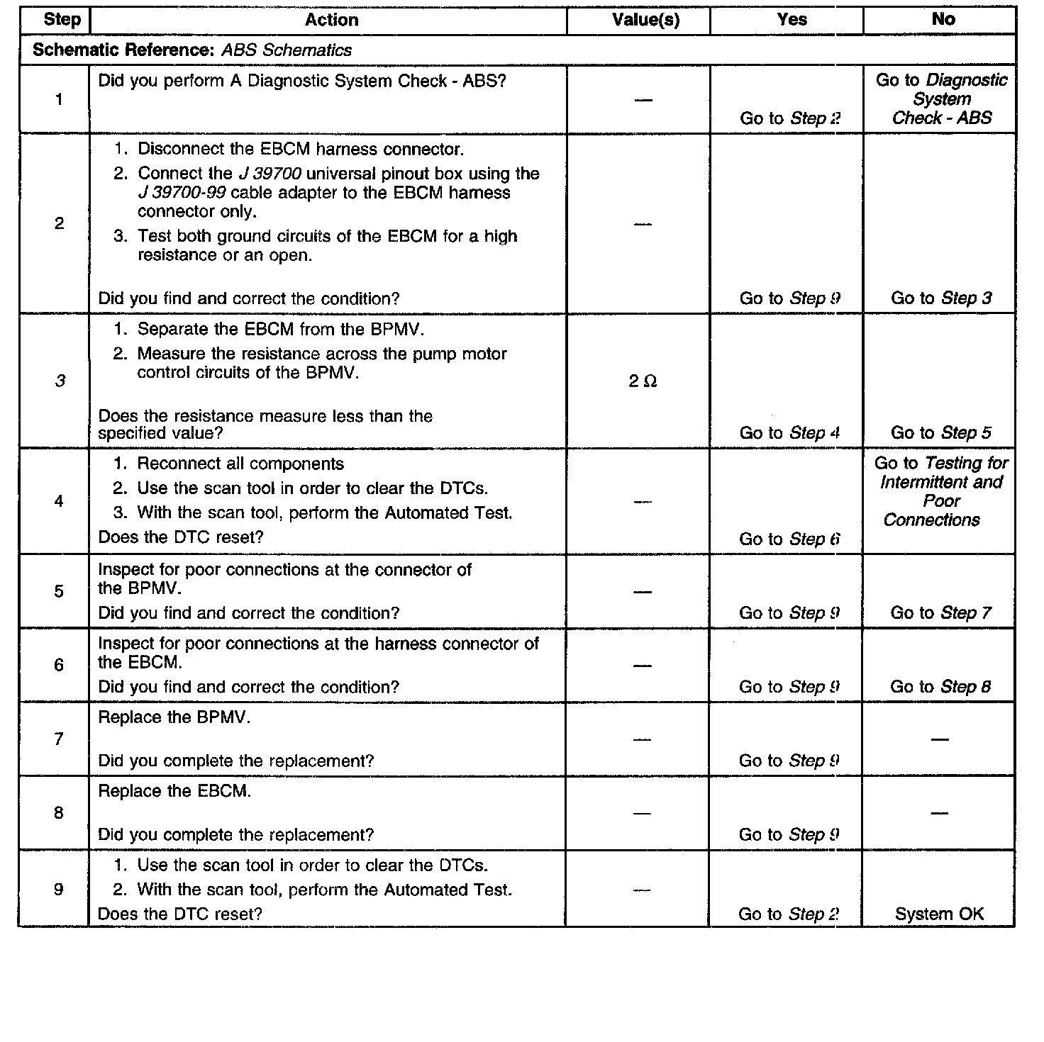 3. This step tests the pump motor circuits of the BPMV for an open. The wiring from the EBCM to the BPMV should not be repaired.