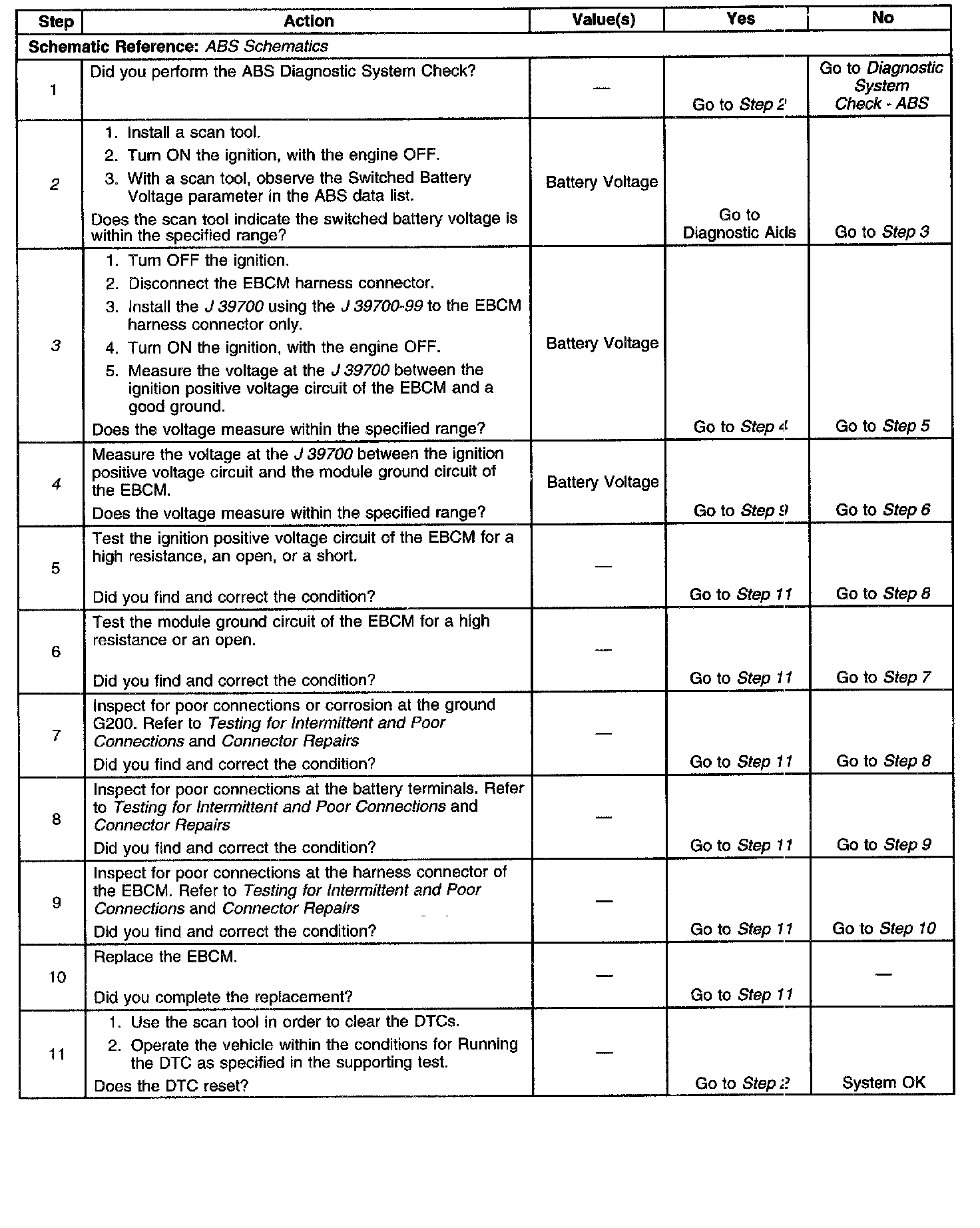 This DTC is used to monitor the voltage level available to the EBCM. If the voltage drops below specific levels at specific times, full performance of the ABS system cannot be guaranteed. During an ABS event, there are several current requirements that will cause battery voltage to drop. Because of this, voltage is monitored prior to an ABS event and also during an ABS event operation when voltage may drop significantly.