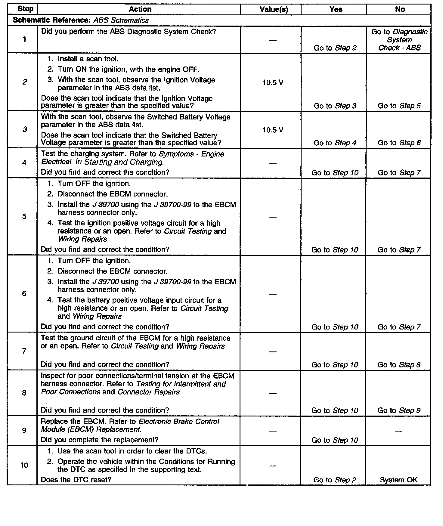 When the electronic brake control relay is activated (turned ON), voltage is supplied to the valve solenoids and pump motor. This DTC will set if the EBCM looses ground or battery voltage, or if the battery is disconnected while running.