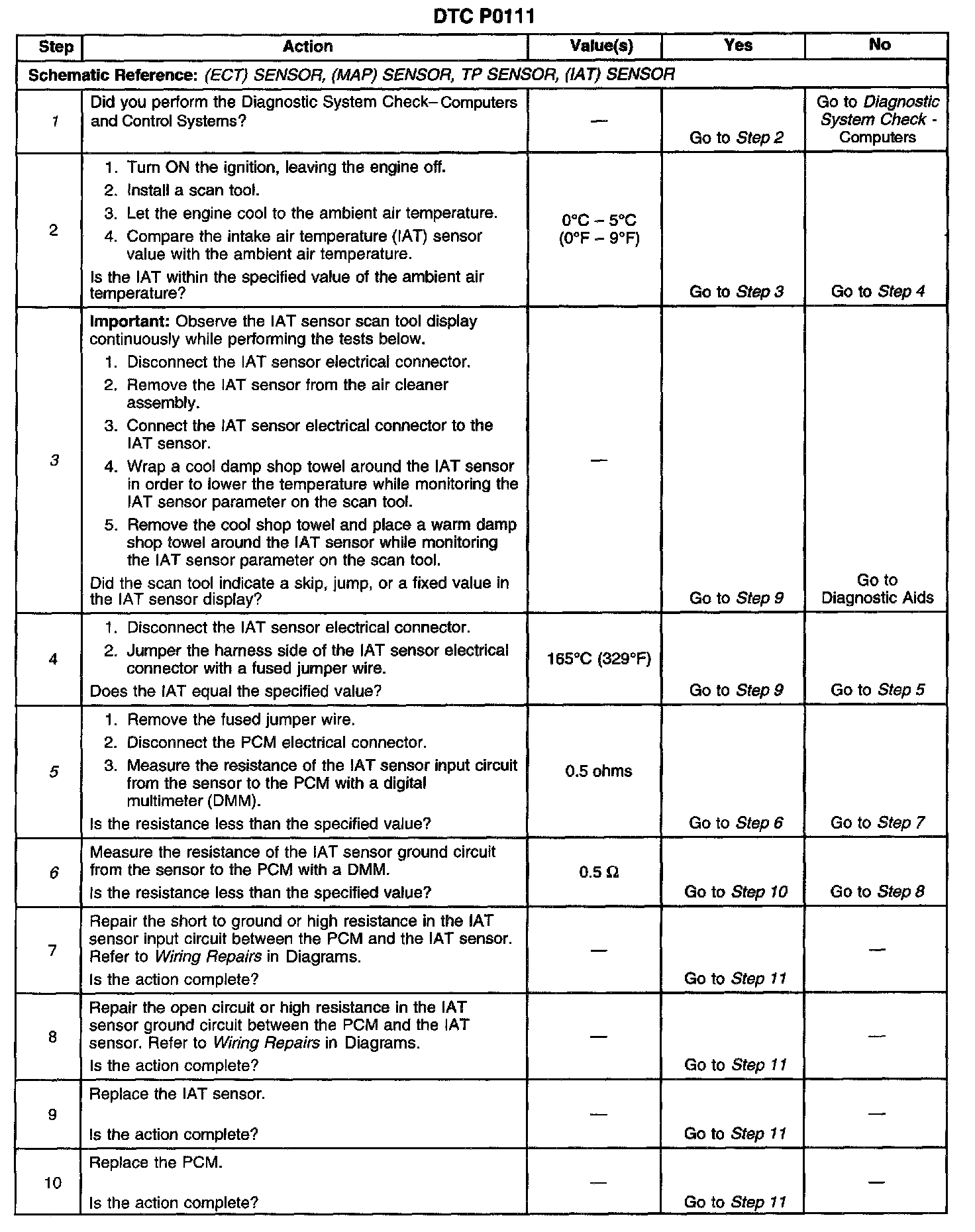 CIRCUIT DESCRIPTIONThe DTC P0111 Intake Air Temperature (IAT) Sensor Performance diagnostic checks the accuracy of the IAT sensor signal. A thermistor is a resistor whose value varies with the temperature. The electrical resistance of the IAT sensor is high when the intake air temperature is cold, and the resistance is low when the air temperature is warm. The IAT sensor is wired in series with a fixed resistor in the Powertrain Control Module (PCM). The PCM applies 5 volts to the IAT sensor. The PCM monitors the voltage across the IAT sensor and converts the voltage into a temperature reading. The voltage measured by the PCM will be high when the intake air temperature is cold, and low when the air temperature is warm.