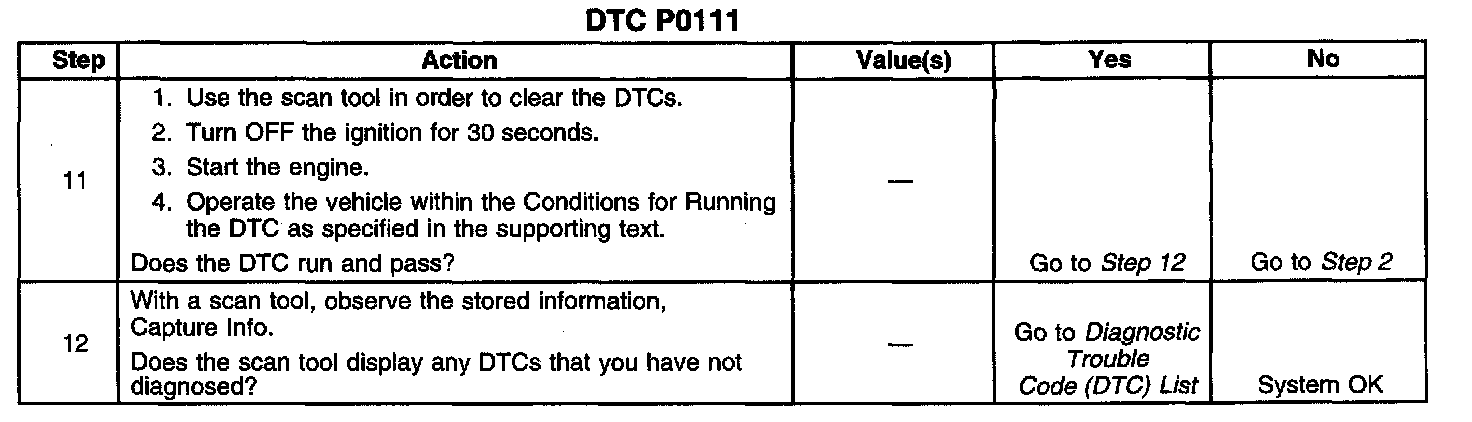 If a DTC P0111 is intermittent, driving the vehicle under the following conditions can verify whether the fault is present. Perform the scan tool clear DTC information function. Road test the vehicle while monitoring the DTC P0111 diagnostic on the scan tool under the Not Ran Since Code Cleared selection in the DTC Information menu. If a DTC P0111 appears in the Not Ran Since Code Cleared list, the P0111 diagnostic has not yet run. When the DTC P0111 does not appear in the Not Ran Since Code Cleared list, the P0111 diagnostic has run. If the MIL is NOT ILLUMINATED, and there is no PENDING DTC Status in DTC Information, the P0111 diagnostic has passed. DTCs MUST BE CLEARED in order to view the CURRENT STATUS of the Not Ran Since Code Cleared list. DO NOT FORGET that the Not Ran Since Code Cleared list only indicates that the test has run, not whether the test passed or failed. The DTC Information screen must be checked for CURRENT or PENDING status, in order to determine the outcome of the diagnostic test involved.