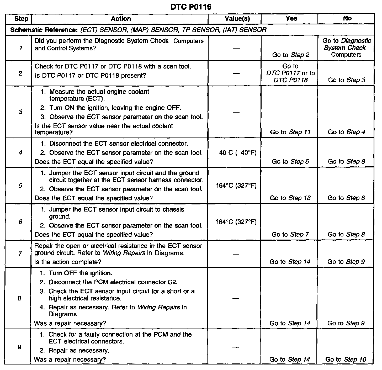 ^ Use the Temperature vs Resistance table in order to evaluate the possibility of a shifted (incorrectly calibrated) ECT sensor. A shifted sensor may result in a DTC P0116. Refer to Temperature vs Resistance. [1][2]Computers and Control Systems