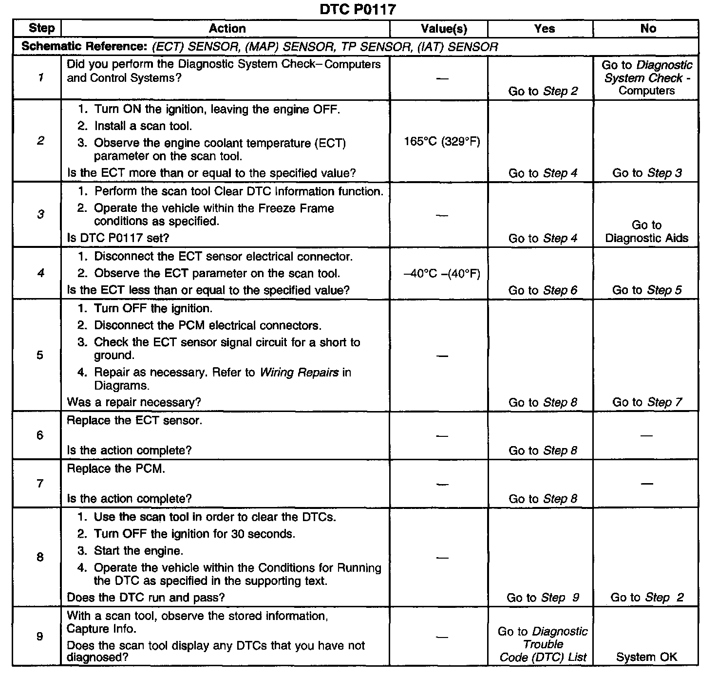 CIRCUIT DESCRIPTIONThe DTC P0117 Engine Coolant Temperature (ECT) Sensor Circuit Low Voltage diagnostic monitors the ECT sensor signal. The ECT sensor is a thermistor. A thermistor is a resistor whose value varies with the temperature. The electrical resistance of the ECT sensor is high when the coolant temperature is cold, and the resistance is low when the coolant temperature is warm. The ECT sensor is wired in series with a fixed resistor in the Powertrain Control Module (PCM). The PCM applies 5 volts to the ECT sensor. The PCM monitors the voltage across the ECT sensor and converts the voltage into a temperature reading. The voltage measured by the PCM will be high when the coolant temperature is cold, and low when the coolant temperature is warm.
