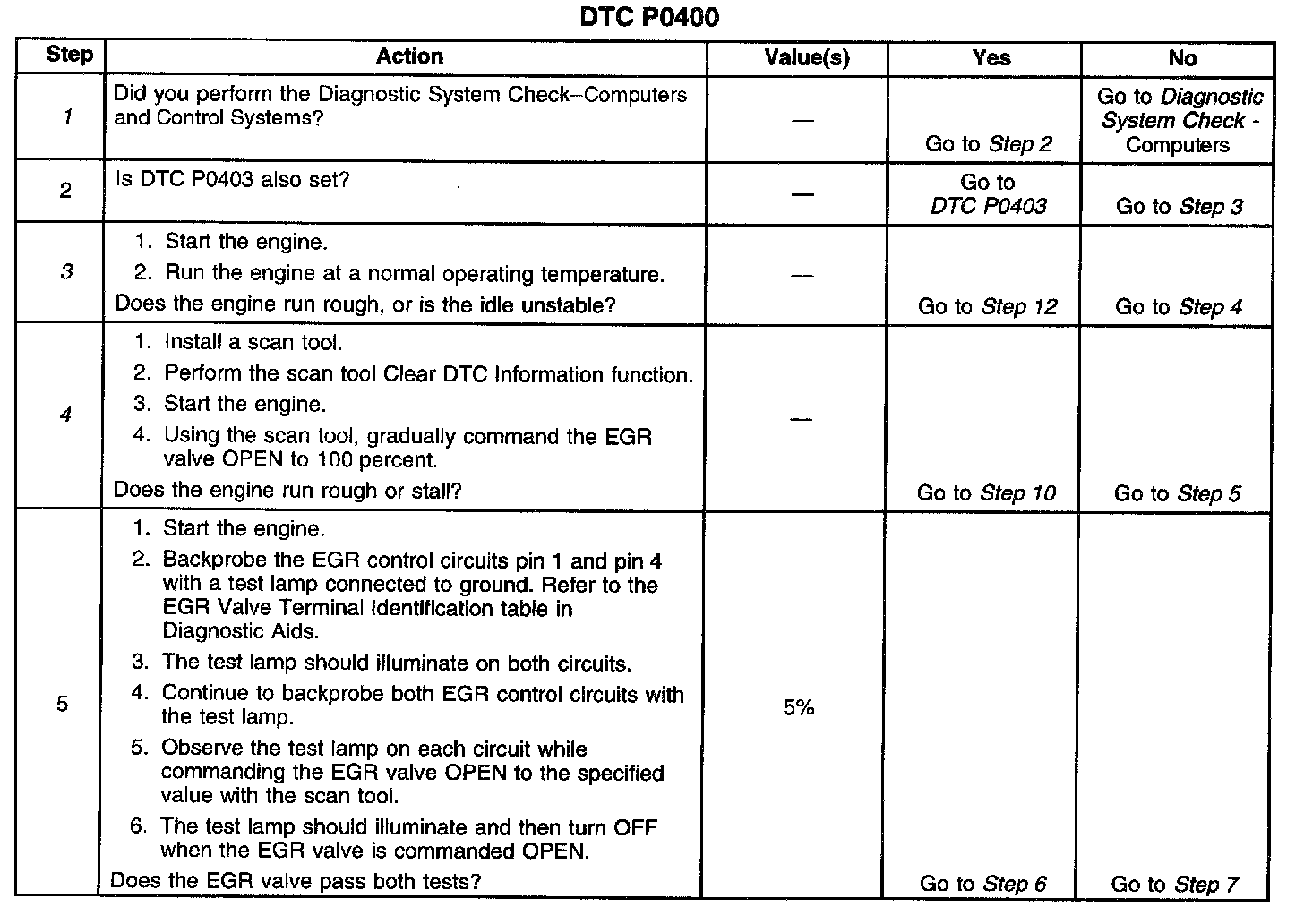 4. This step checks the operation of the EGR valve. The duty cycle output control of the EGR is disabled by the PCM when any DTCs are stored and when the engine temperature is less than 80°C (176°F).