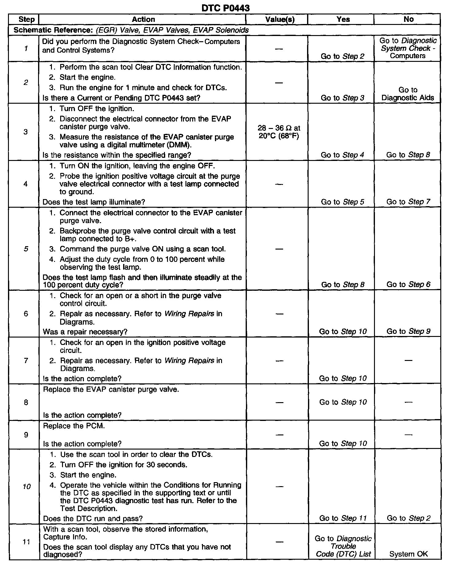 CIRCUIT DESCRIPTIONThe DTC P0443 EVAP System Incorrect Purge Flow diagnostic monitors the control circuit voltage of the EVAP canister purge valve. Ignition voltage is supplied directly to the EVAP canister purge valve solenoid. The Powertrain Control Module (PCM) supplies a ground path to the solenoid control circuit using an internal solid state device called a driver. Each driver has a fault line that is monitored by the PCM. When the PCM commands the solenoid ON, the voltage on the control circuit should be near zero or low. When the PCM commands the solenoid OFF, the voltage on the control circuit should be near battery voltage or high. If the fault detection circuit senses a voltage other than what is expected, this DTC will set.