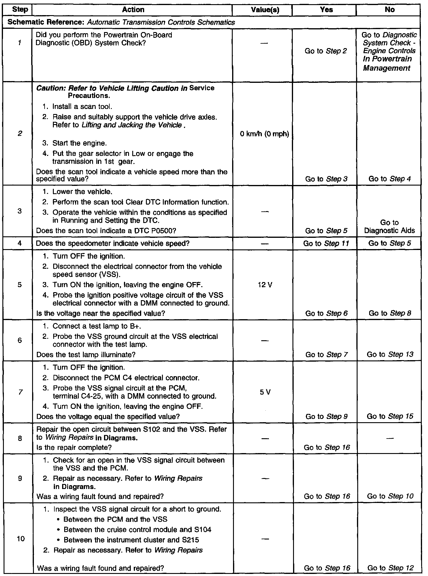 If the DTC P0500 is intermittent, driving the vehicle under the following conditions can verify whether the fault is present. Perform the scan tool Clear DTC Information function. Road test the vehicle while monitoring the DTC P0500 diagnostic on the scan tool under the Not Ran Since Code Cleared selection in the DTC Information menu. If a DTC P0500 appears in the Not Ran Since Code Cleared list, the P0500 diagnostic has not yet run. When the DTC P0500 does not appear in the Not Ran Since Code Cleared list, the P0500 diagnostic has run. If the MIL is NOT illuminated, and there is no Pending DTC Status in DTC Information, the P0500 diagnostic has passed. The DTCs MUST be cleared in order to view the Current Status of the Not Ran Since Code Cleared list. DO NOT forget that the Not Ran Since Code Cleared list only indicates that the test has run, not whether the test passed or failed. The DTC Information screen must be checked for Current or Pending status in order to determine the outcome of the diagnostic test involved.