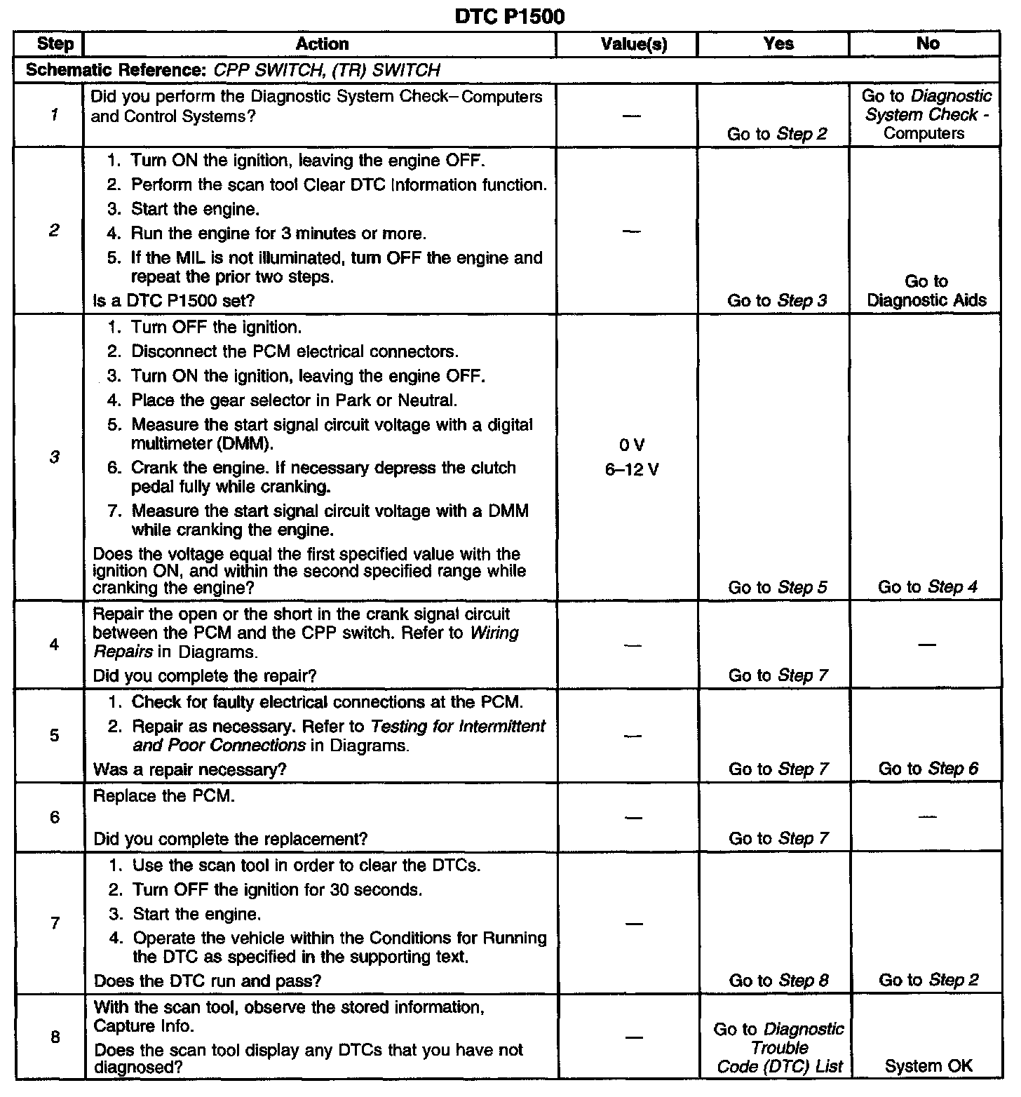 CIRCUIT DESCRIPTIONThe DTC P1500 Start Switch Circuit diagnostic monitors the voltage signal that is sent from the ignition switch when starting the engine. When the engine is being cranked, battery voltage is applied to the Powertrain Control Module (PCM). The starter signal is mainly used to increase the fuel injection volume for the starting injection control. This signal passes through the Transmission Range (TR) switch or the Clutch Pedal Position (CPP) switch. If this signal is not detected during engine cranking, the PCM will still allow the engine to start.