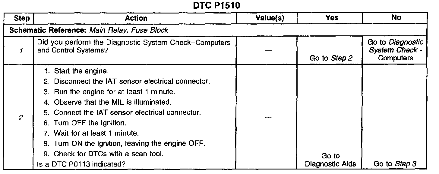 If the DTC P1510 is intermittent, driving the vehicle under the following conditions can verify whether the fault is present. Perform the scan tool Clear DTC Information function. Road test the vehicle while monitoring the DTC P1510 diagnostic on the scan tool under the Not Ran Since Code Cleared selection in the DTC Information menu. If DTC P1510 appears in the Not Ran Since Code Cleared list, the P1510 diagnostic has not yet run. When DTC P1510 does not appear in the Not Ran Since Code Cleared list, the P1510 diagnostic has run. If the MIL is NOT illuminated and there is no Pending DTC Status in DTC Information, the P1510 diagnostic has passed. The DTCs MUST be cleared in order to view the Current Status of the Not Ran Since Code Cleared list. DO NOT forget that the Not Ran Since Code Cleared list only indicates that the test has run, not whether the test passed or failed. The DTC Information screen must be checked for Current or Pending status in order to determine the outcome of the diagnostic test involved.