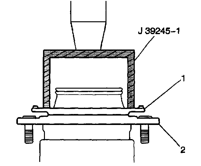 1. Using J39245, press the ABS reluctor ring (2) onto the wheel hub.