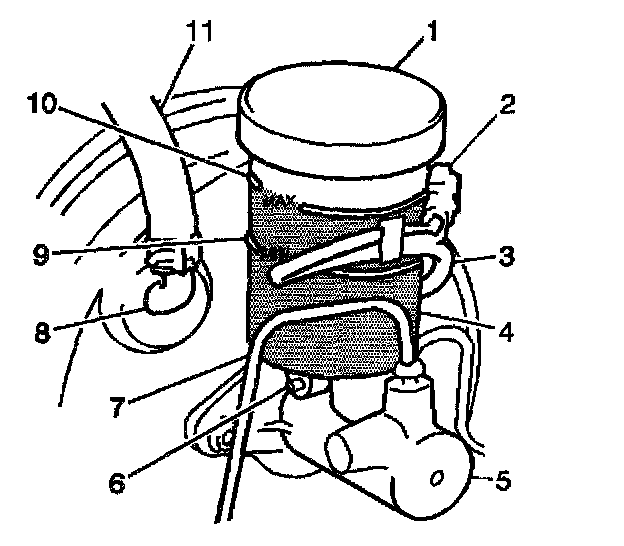 5. Fill the reservoir with brake fluid. Keep the reservoir at least one-half full during the bleeding operation. Refer to Master Cylinder Reservoir Filling.