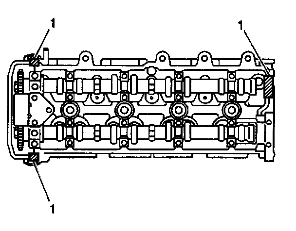 3. Apply GM P/N 12346240 or equivalent to the cylinder head at the points indicated (1).