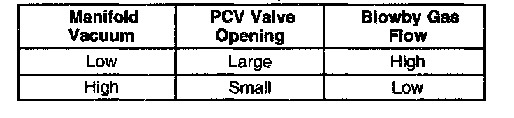 In order to maintain idle quality, the PCV valve restricts the flow of blowby gas whenever intake manifold vacuum is high. Abnormally high crankcase pressure may cause the blowby gases to flow through the crankcase vent tube and into the air cleaner. The blowby gases are then drawn into the intake system and consumed in the normal combustion process. The relationship between the flow of blowby gas and engine manifold vacuum is charted in the table.