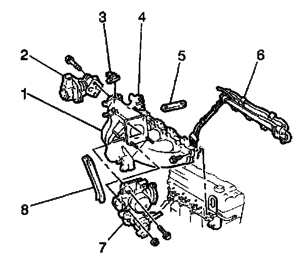 10. Remove the 2 bolts and the intake manifold front support bracket (8).