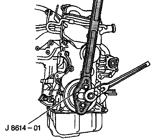 3. Install the crankshaft pulley retaining bolt using the J 8614-01 to prevent crankshaft rotation when tightening the bolt.