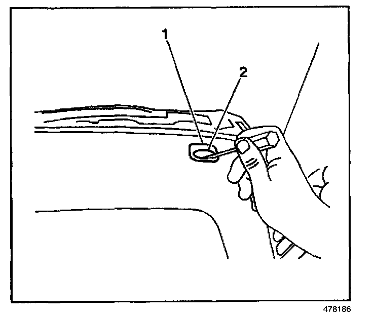 1. Using a taped flat bladed tool, gently pry the ambient light sensor (2) from the upper right IP mounting bolt trim cover (1).