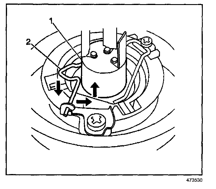 4. Push the headlamp bulb retainer (2) downward and to the side to release the headlamp bulb (1).